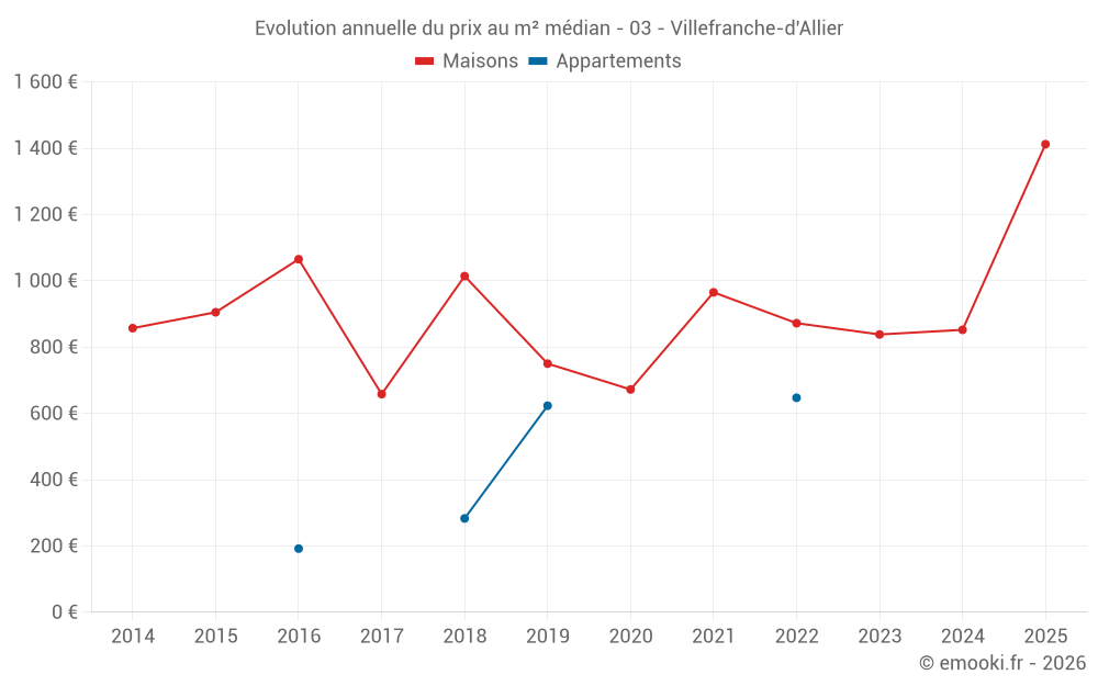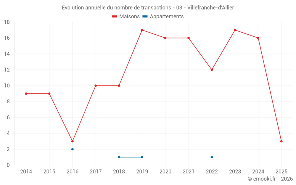 Le prix médian sur les 26 transactions de maisons des 24 derniers mois dans la commune de Villefranche-d'Allier était de 912 € par mètre carré pour une valeur foncière médiane de 83 275 €. Sur cette période 60% des transactions se sont situées entre 524 et 1 625 € par mètre carré (du 2ème au 8ème déciles).