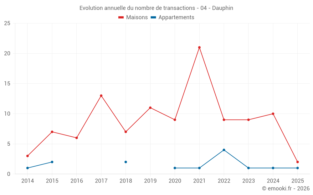 Le prix médian sur les 16 transactions de maisons des 24 derniers mois dans la commune de Dauphin était de 2 667 € par mètre carré pour une valeur foncière médiane de 250 000 €. Sur cette période 60% des transactions se sont situées entre 2 197 et 3 556 € par mètre carré (du 2ème au 8ème déciles).