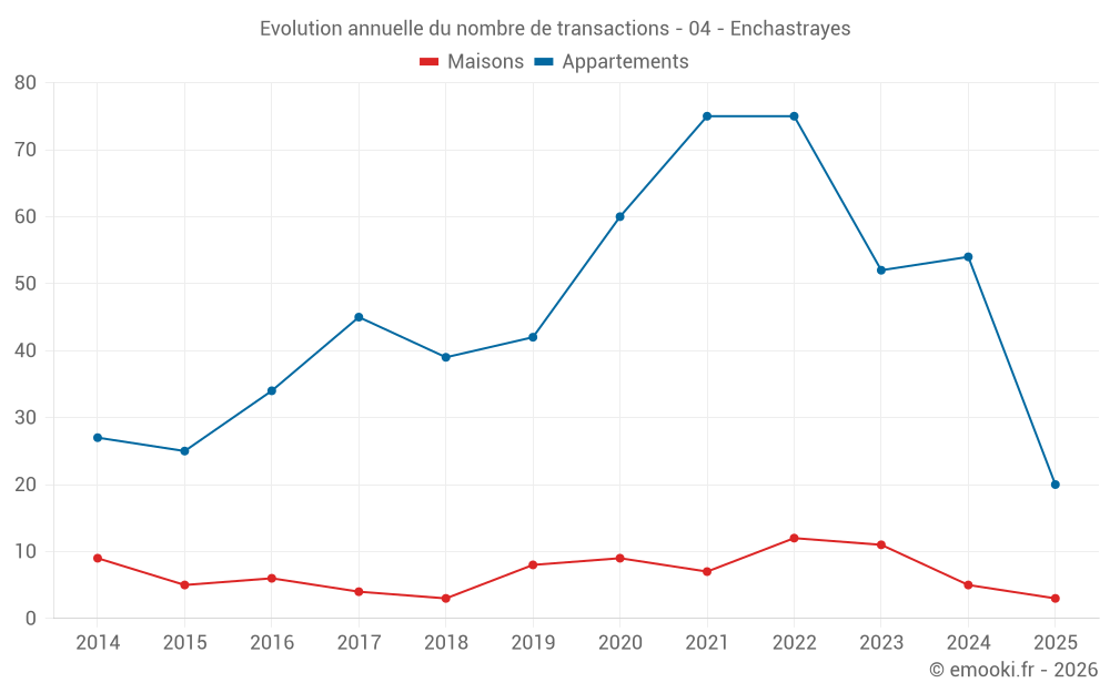 Le prix médian sur les 20 transactions d'appartements des 6 derniers mois dans la commune d'Enchastrayes était de 2 335 € par mètre carré pour une valeur foncière médiane de 64 500 €. Sur cette période 60% des transactions se sont situées entre 1 911 et 2 900 € par mètre carré (du 2ème au 8ème déciles).