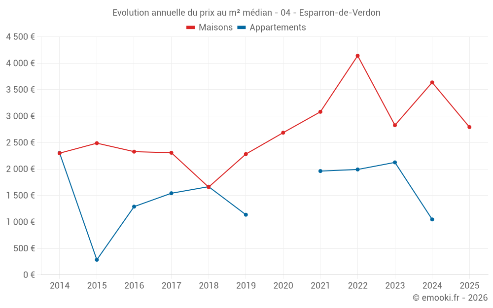 Le prix médian sur les 24 transactions de maisons des 24 derniers mois dans la commune d'Esparron-de-Verdon était de 3 124 € par mètre carré pour une valeur foncière médiane de 251 375 €. Sur cette période 60% des transactions se sont situées entre 1 660 et 4 579 € par mètre carré (du 2ème au 8ème déciles).