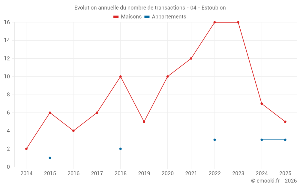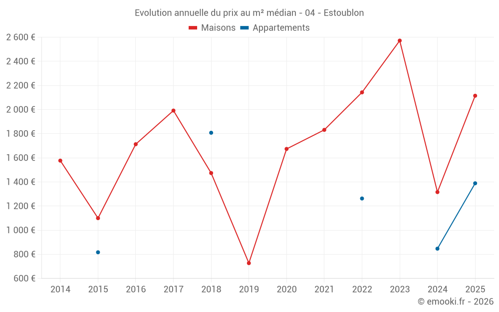 Le prix médian sur les 20 transactions de maisons des 24 derniers mois dans la commune d'Estoublon était de 2 365 € par mètre carré pour une valeur foncière médiane de 205 000 €. Sur cette période 60% des transactions se sont situées entre 1 284 et 2 839 € par mètre carré (du 2ème au 8ème déciles).