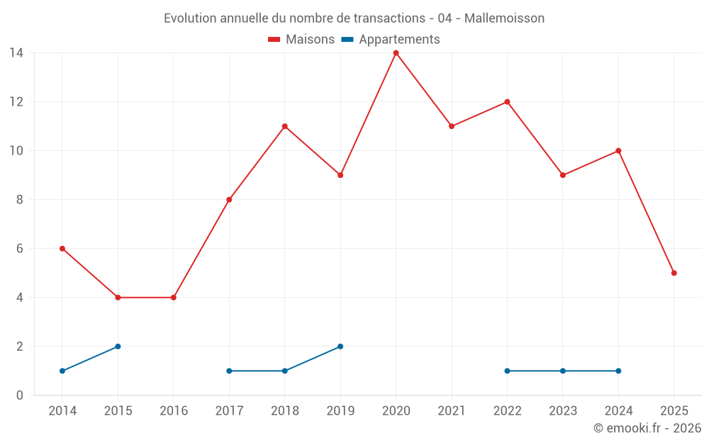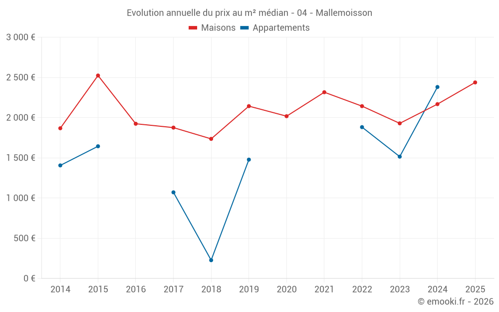 Le prix médian sur les 18 transactions de maisons des 24 derniers mois dans la commune de Mallemoisson était de 2 204 € par mètre carré pour une valeur foncière médiane de 192 500 €. Sur cette période 60% des transactions se sont situées entre 1 537 et 2 916 € par mètre carré (du 2ème au 8ème déciles).