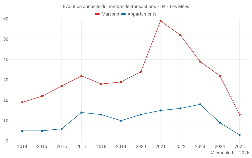 Le prix médian sur les 29 transactions de maisons des 12 derniers mois dans la commune des Mées était de 2 055 € par mètre carré pour une valeur foncière médiane de 200 000 €. Sur cette période 60% des transactions se sont situées entre 1 532 et 2 945 € par mètre carré (du 2ème au 8ème déciles).