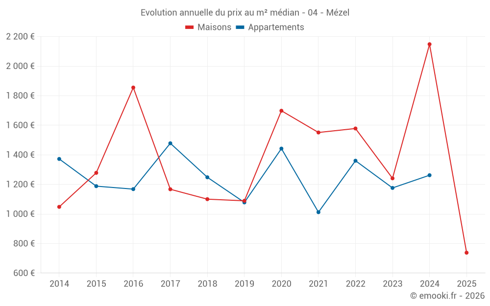 Le prix médian sur les 14 transactions de maisons des 24 derniers mois dans la commune de Mézel était de 1 730 € par mètre carré pour une valeur foncière médiane de 107 500 €. Sur cette période 60% des transactions se sont situées entre 956 et 2 513 € par mètre carré (du 2ème au 8ème déciles).