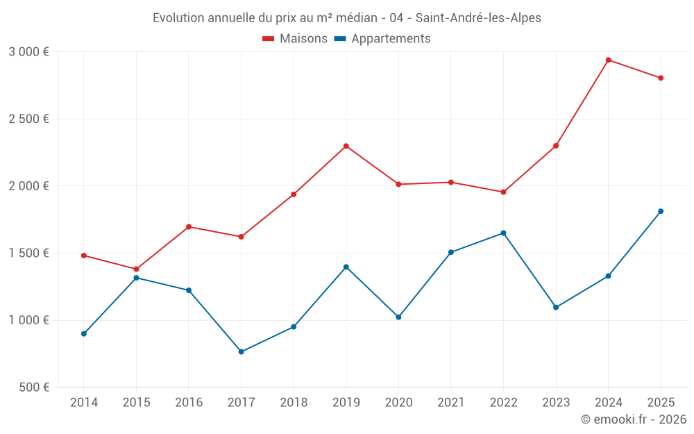 Le prix médian sur les 19 transactions d'appartements des 24 derniers mois dans la commune de Saint-André-les-Alpes était de 1 432 € par mètre carré pour une valeur foncière médiane de 109 500 €. Sur cette période 60% des transactions se sont situées entre 1 013 et 2 058 € par mètre carré (du 2ème au 8ème déciles).