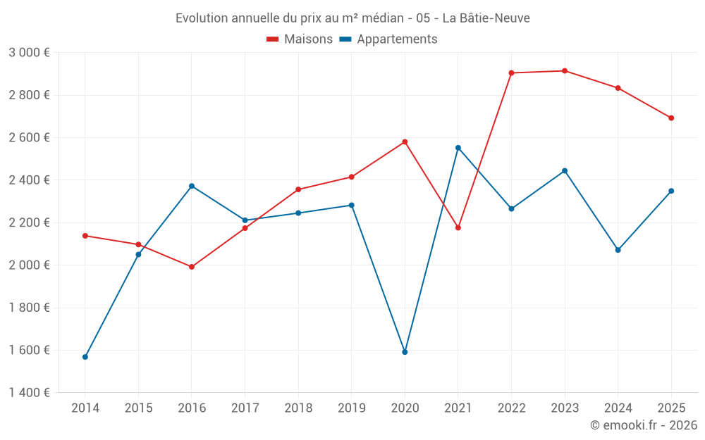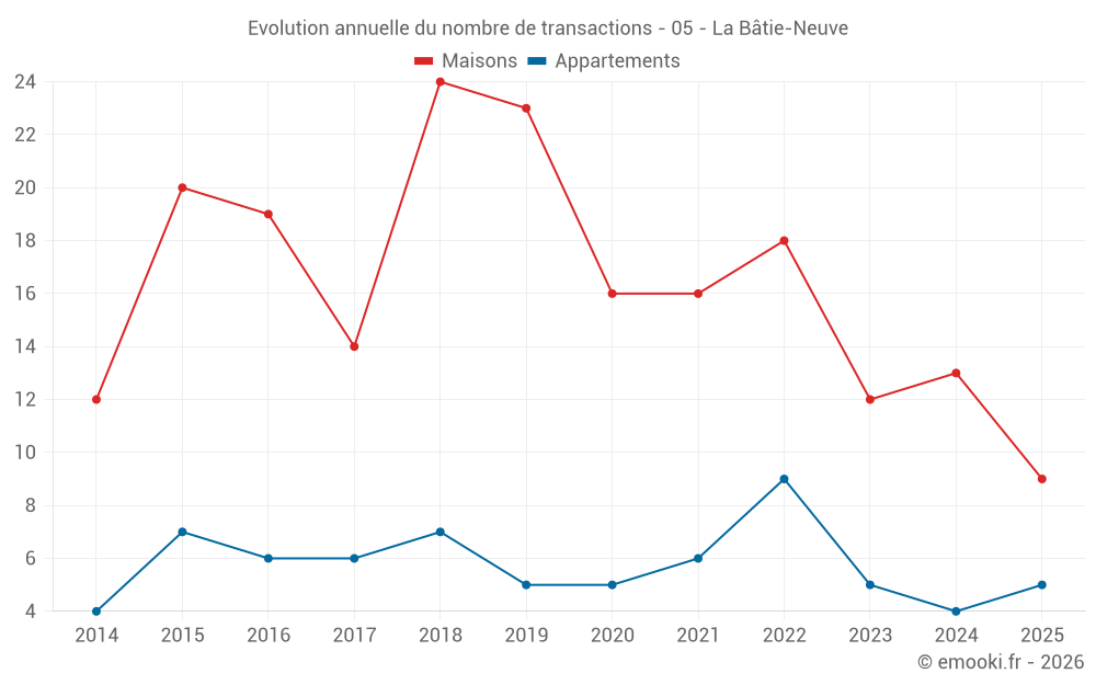 Le prix médian sur les 29 transactions de maisons des 24 derniers mois dans la commune de la Bâtie-Neuve était de 2 766 € par mètre carré pour une valeur foncière médiane de 290 450 €. Sur cette période 60% des transactions se sont situées entre 2 156 et 3 691 € par mètre carré (du 2ème au 8ème déciles).