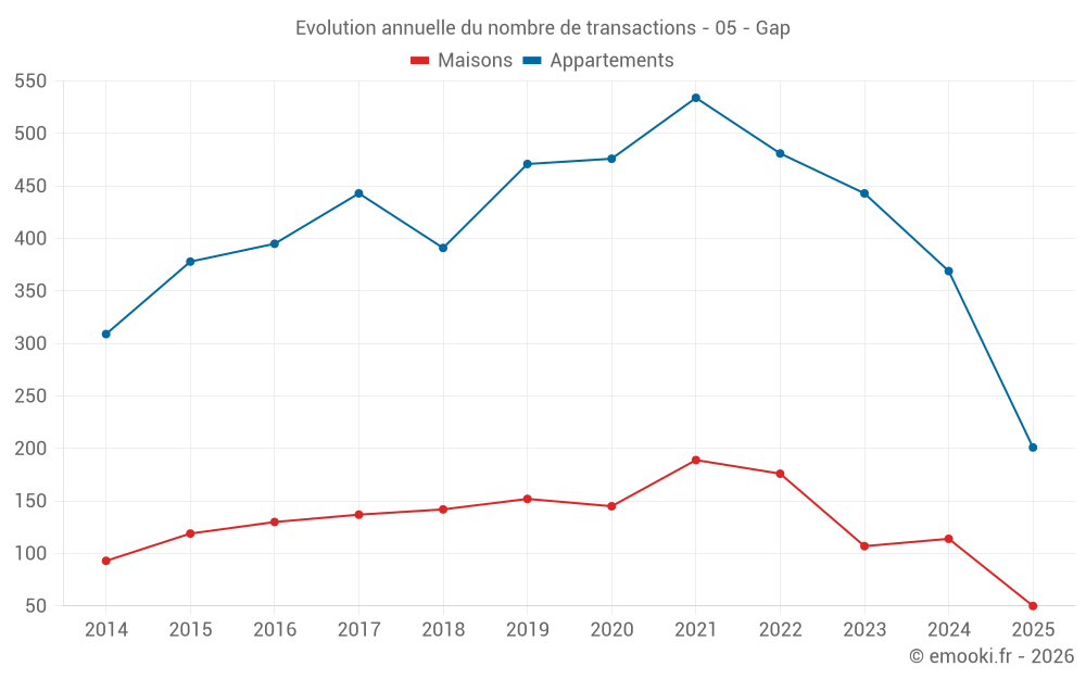 Le prix médian sur les 21 transactions de maisons des 3 derniers mois dans la commune de Gap était de 3 082 € par mètre carré pour une valeur foncière médiane de 320 000 €. Sur cette période 60% des transactions se sont situées entre 2 400 et 3 754 € par mètre carré (du 2ème au 8ème déciles).