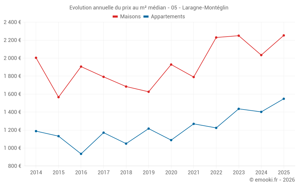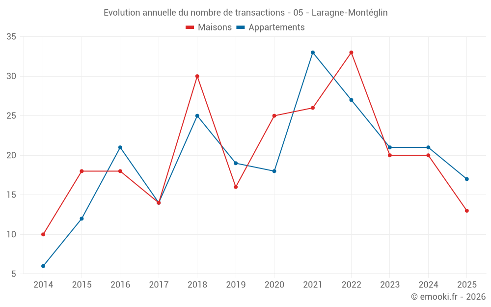 Le prix médian sur les 22 transactions de maisons des 12 derniers mois dans la commune de Laragne-Montéglin était de 2 300 € par mètre carré pour une valeur foncière médiane de 173 750 €. Sur cette période 60% des transactions se sont situées entre 1 509 et 2 539 € par mètre carré (du 2ème au 8ème déciles).
