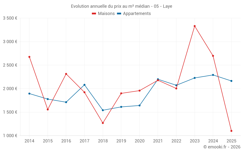 Le prix médian sur les 21 transactions d'appartements des 24 derniers mois dans la commune de Laye était de 2 398 € par mètre carré pour une valeur foncière médiane de 95 000 €. Sur cette période 60% des transactions se sont situées entre 2 070 et 2 696 € par mètre carré (du 2ème au 8ème déciles).