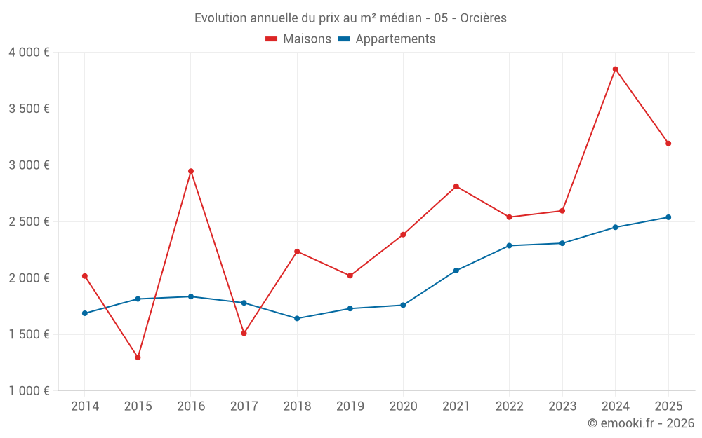 Le prix médian sur les 19 transactions de maisons des 24 derniers mois dans la commune d'Orcières était de 3 851 € par mètre carré pour une valeur foncière médiane de 275 000 €. Sur cette période 60% des transactions se sont situées entre 2 325 et 4 339 € par mètre carré (du 2ème au 8ème déciles).