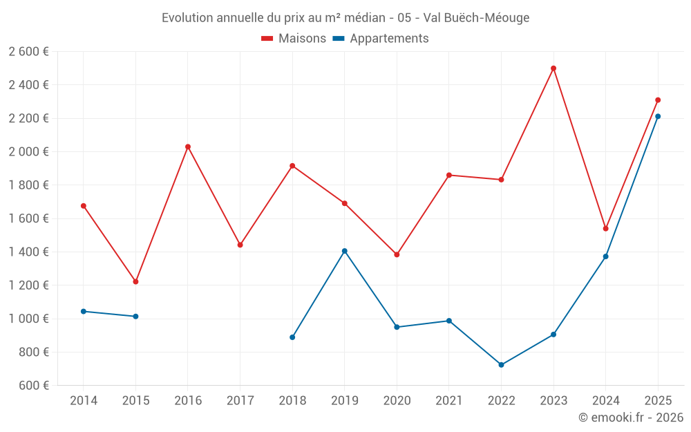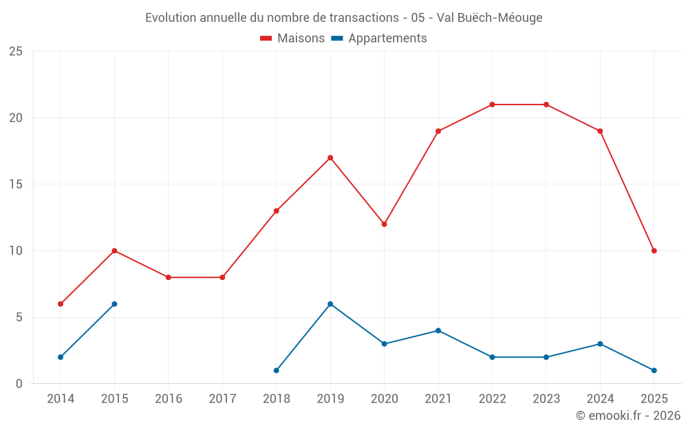 Le prix médian sur les 22 transactions de maisons des 12 derniers mois dans la commune de Val Buëch-Méouge était de 2 042 € par mètre carré pour une valeur foncière médiane de 167 650 €. Sur cette période 60% des transactions se sont situées entre 1 346 et 2 656 € par mètre carré (du 2ème au 8ème déciles).