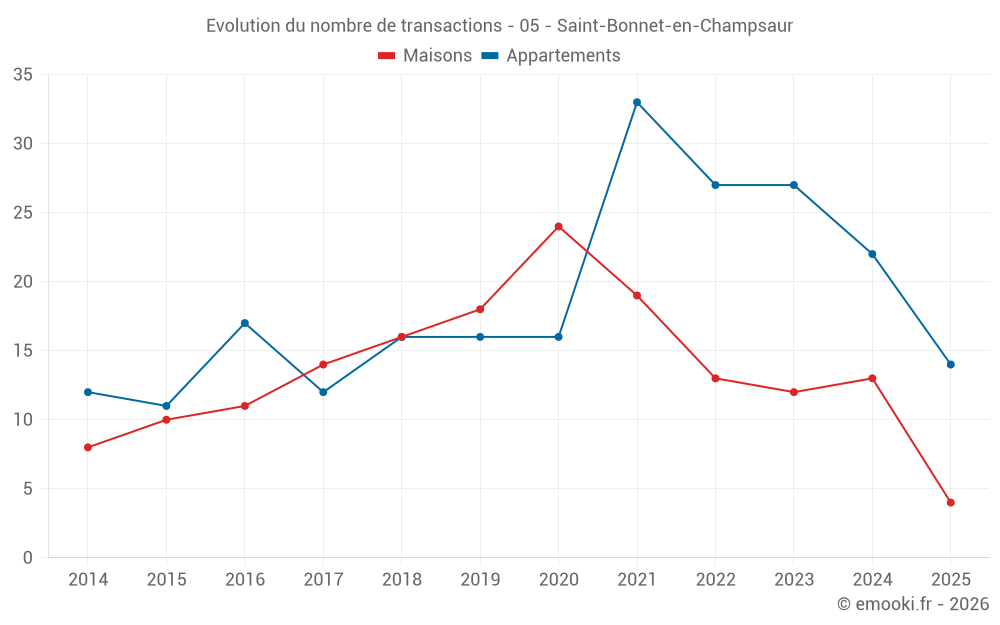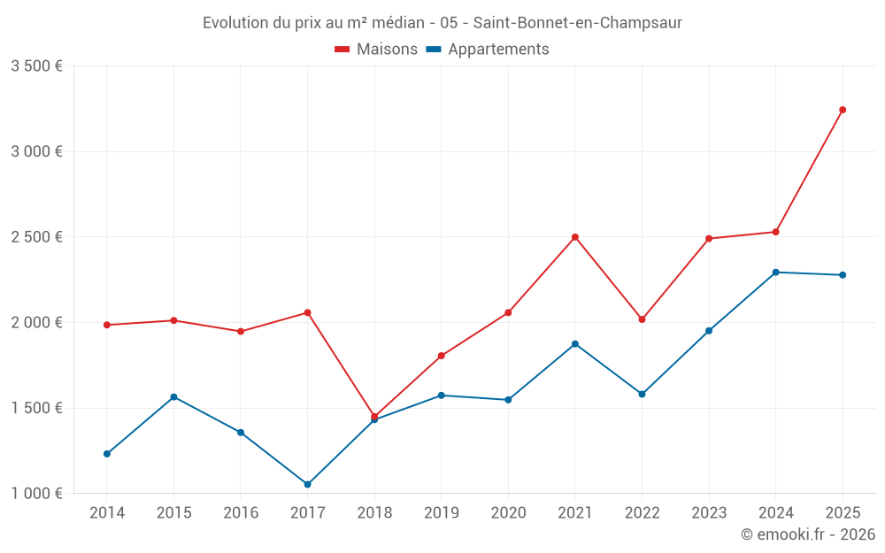 Le prix médian sur les 22 transactions de maisons des 24 derniers mois dans la commune de Saint-Bonnet-en-Champsaur était de 2 633 € par mètre carré pour une valeur foncière médiane de 223 500 €. Sur cette période 60% des transactions se sont situées entre 1 926 et 3 566 € par mètre carré (du 2ème au 8ème déciles).
