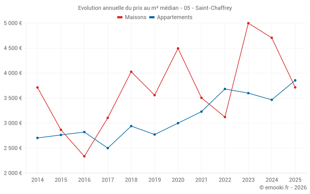 Le prix médian sur les 17 transactions de maisons des 24 derniers mois dans la commune de Saint-Chaffrey était de 4 213 € par mètre carré pour une valeur foncière médiane de 399 600 €. Sur cette période 60% des transactions se sont situées entre 3 182 et 6 759 € par mètre carré (du 2ème au 8ème déciles).