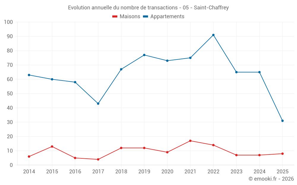 Le prix médian sur les 21 transactions d'appartements des 3 derniers mois dans la commune de Saint-Chaffrey était de 3 690 € par mètre carré pour une valeur foncière médiane de 123 030 €. Sur cette période 60% des transactions se sont situées entre 2 308 et 5 388 € par mètre carré (du 2ème au 8ème déciles).