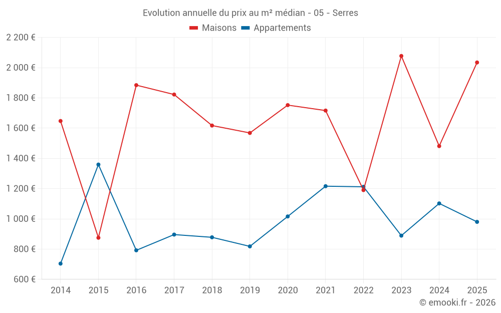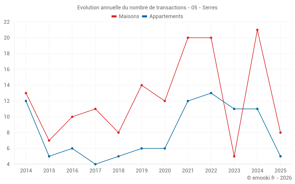Le prix médian sur les 22 transactions d'appartements des 24 derniers mois dans la commune de Serres était de 970 € par mètre carré pour une valeur foncière médiane de 90 500 €. Sur cette période 60% des transactions se sont situées entre 782 et 1 478 € par mètre carré (du 2ème au 8ème déciles).