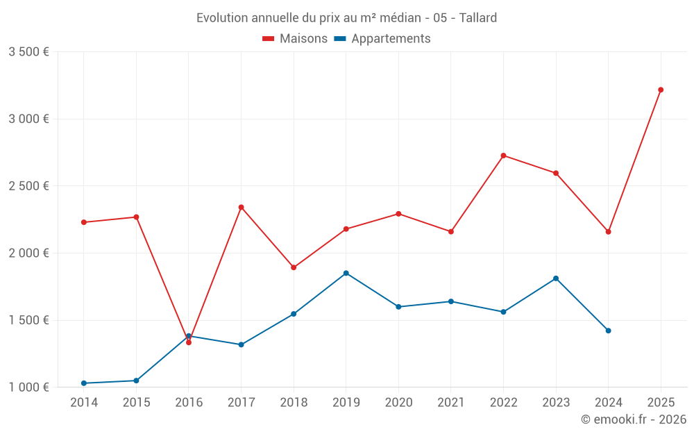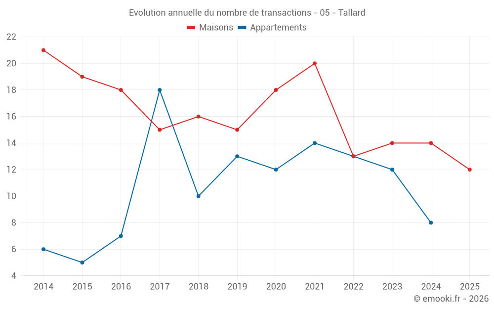 Le prix médian sur les 16 transactions de maisons des 12 derniers mois dans la commune de Tallard était de 2 906 € par mètre carré pour une valeur foncière médiane de 199 750 €. Sur cette période 60% des transactions se sont situées entre 2 177 et 4 033 € par mètre carré (du 2ème au 8ème déciles).