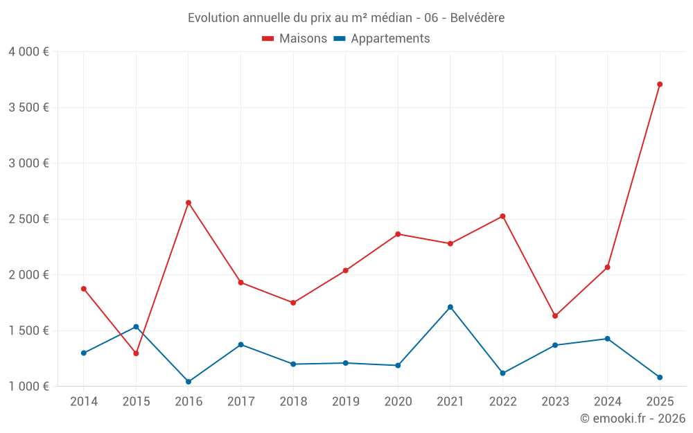 Le prix médian sur les 28 transactions d'appartements des 24 derniers mois dans la commune de Belvédère était de 1 300 € par mètre carré pour une valeur foncière médiane de 59 795 €. Sur cette période 60% des transactions se sont situées entre 933 et 2 002 € par mètre carré (du 2ème au 8ème déciles).