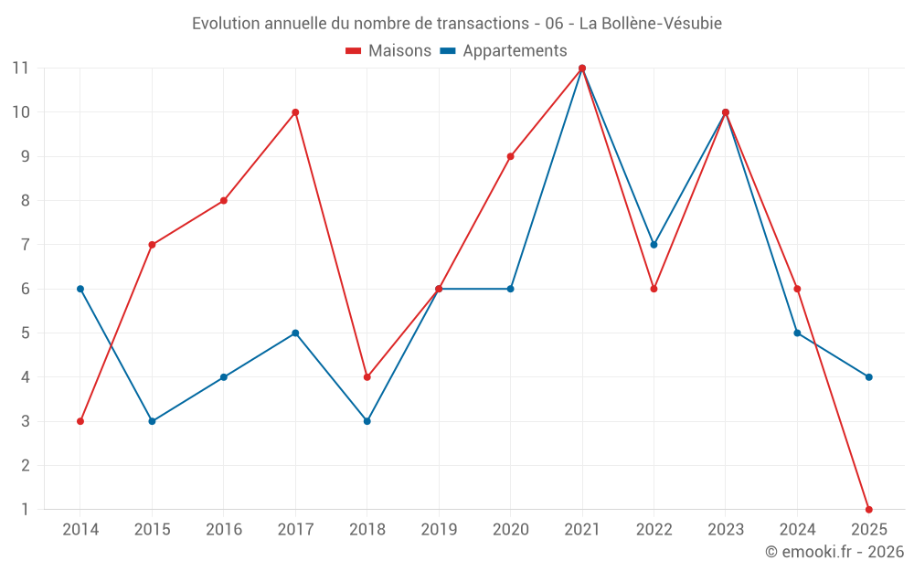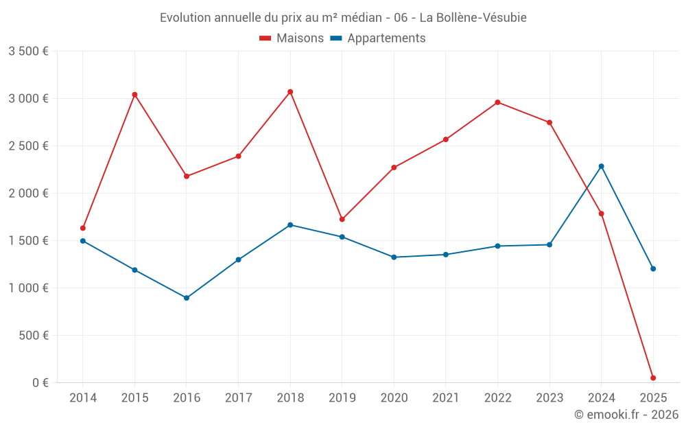 Le prix médian sur les 14 transactions d'appartements des 24 derniers mois dans la commune de la Bollène-Vésubie était de 1 630 € par mètre carré pour une valeur foncière médiane de 91 000 €. Sur cette période 60% des transactions se sont situées entre 1 208 et 2 393 € par mètre carré (du 2ème au 8ème déciles).