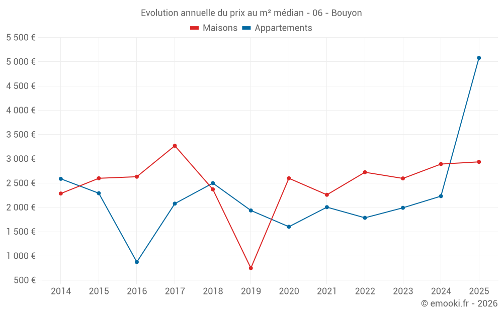 Le prix médian sur les 19 transactions de maisons des 24 derniers mois dans la commune de Bouyon était de 2 885 € par mètre carré pour une valeur foncière médiane de 200 000 €. Sur cette période 60% des transactions se sont situées entre 1 407 et 3 488 € par mètre carré (du 2ème au 8ème déciles).