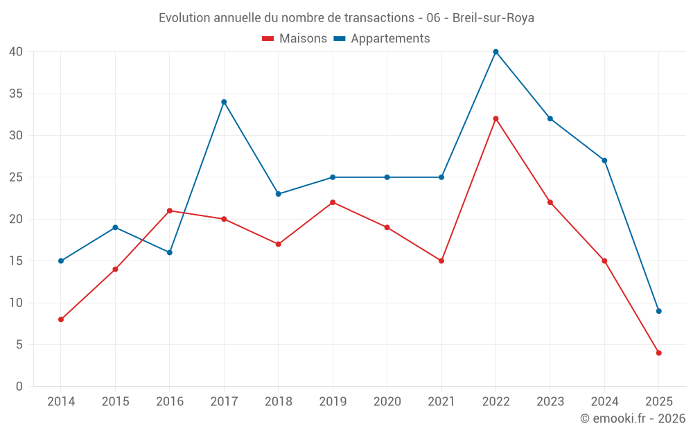 Le prix médian sur les 21 transactions d'appartements des 12 derniers mois dans la commune de Breil-sur-Roya était de 1 189 € par mètre carré pour une valeur foncière médiane de 58 900 €. Sur cette période 60% des transactions se sont situées entre 600 et 2 047 € par mètre carré (du 2ème au 8ème déciles).