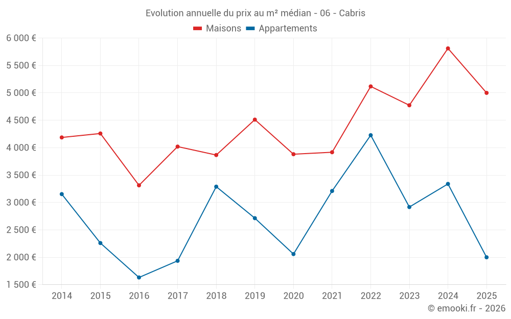 Le prix médian sur les 38 transactions de maisons des 24 derniers mois dans la commune de Cabris était de 5 000 € par mètre carré pour une valeur foncière médiane de 560 625 €. Sur cette période 60% des transactions se sont situées entre 3 570 et 6 576 € par mètre carré (du 2ème au 8ème déciles).