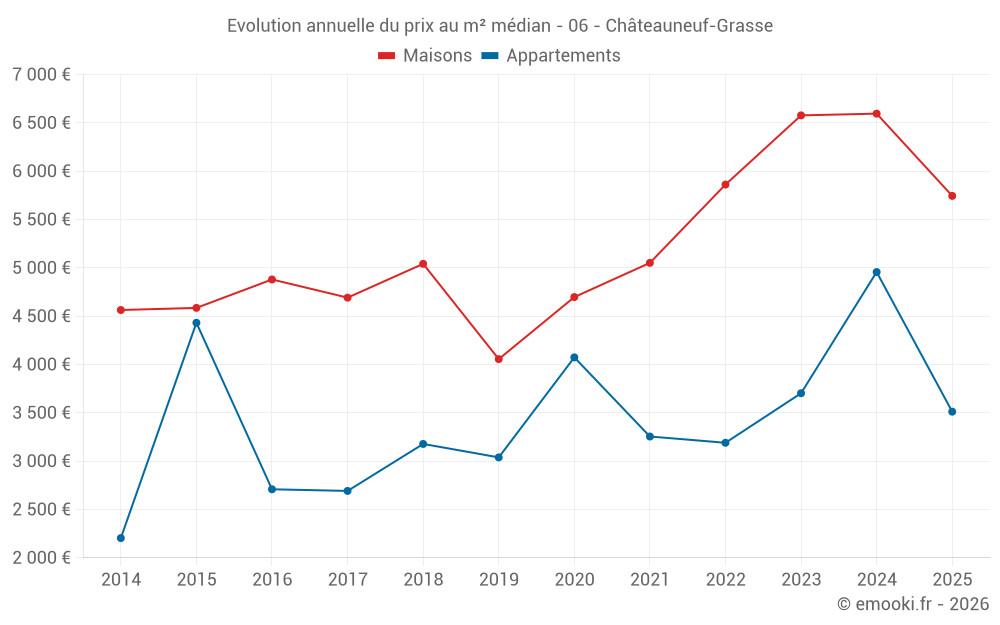 Le prix médian sur les 27 transactions de maisons des 12 derniers mois dans la commune de Châteauneuf-Grasse était de 6 304 € par mètre carré pour une valeur foncière médiane de 1 343 000 €. Sur cette période 60% des transactions se sont situées entre 4 457 et 10 000 € par mètre carré (du 2ème au 8ème déciles).