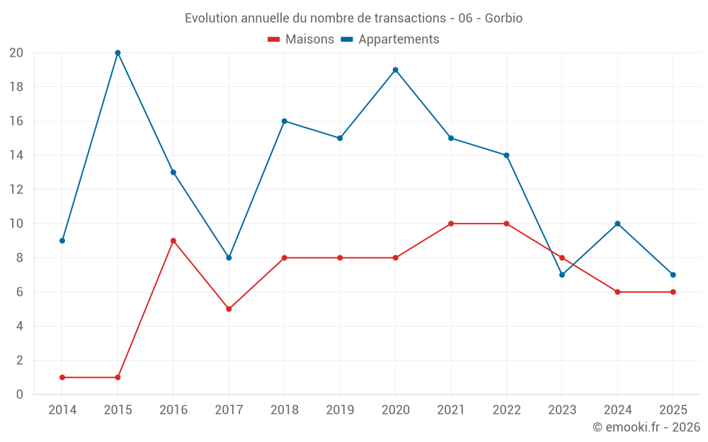 Le prix médian sur les 20 transactions d'appartements des 24 derniers mois dans la commune de Gorbio était de 4 939 € par mètre carré pour une valeur foncière médiane de 237 000 €. Sur cette période 60% des transactions se sont situées entre 2 924 et 5 625 € par mètre carré (du 2ème au 8ème déciles).