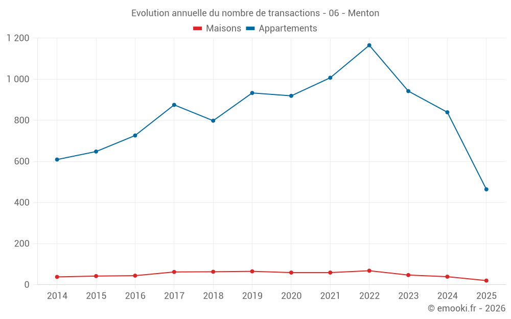 Le prix médian sur les 223 transactions d'appartements des 3 derniers mois dans la commune de Menton était de 4 777 € par mètre carré pour une valeur foncière médiane de 213 000 €. Sur cette période 60% des transactions se sont situées entre 3 842 et 5 799 € par mètre carré (du 2ème au 8ème déciles).