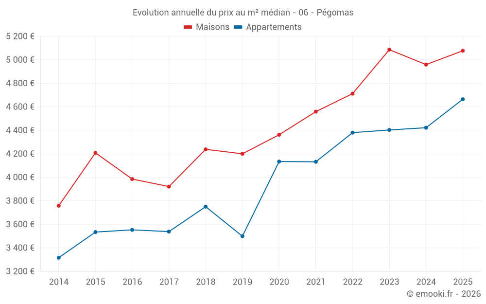 Le prix médian sur les 19 transactions de maisons des 6 derniers mois dans la commune de Pégomas était de 5 077 € par mètre carré pour une valeur foncière médiane de 510 000 €. Sur cette période 60% des transactions se sont situées entre 3 684 et 5 874 € par mètre carré (du 2ème au 8ème déciles).