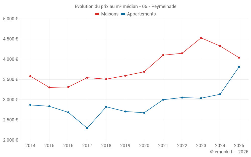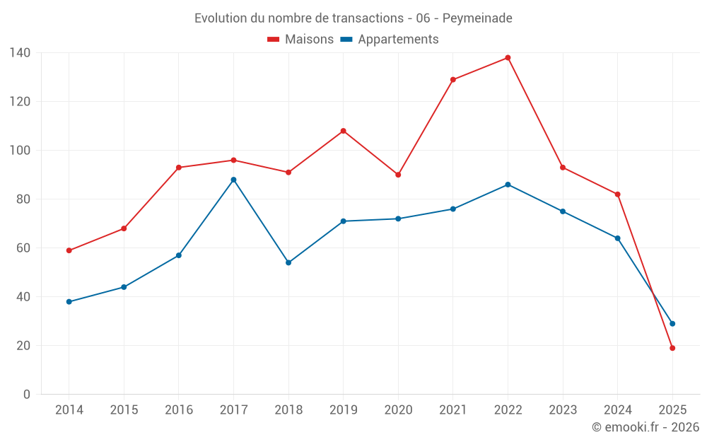 Le prix médian sur les 19 transactions de maisons des 6 derniers mois dans la commune de Peymeinade était de 4 038 € par mètre carré pour une valeur foncière médiane de 485 000 €. Sur cette période 60% des transactions se sont situées entre 3 084 et 5 256 € par mètre carré (du 2ème au 8ème déciles).