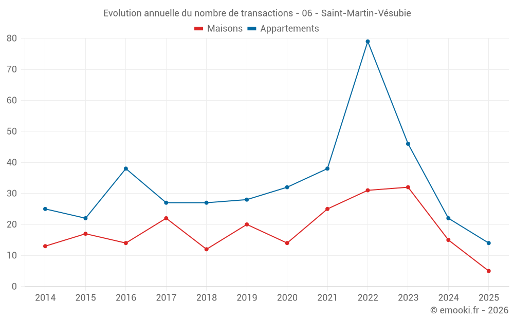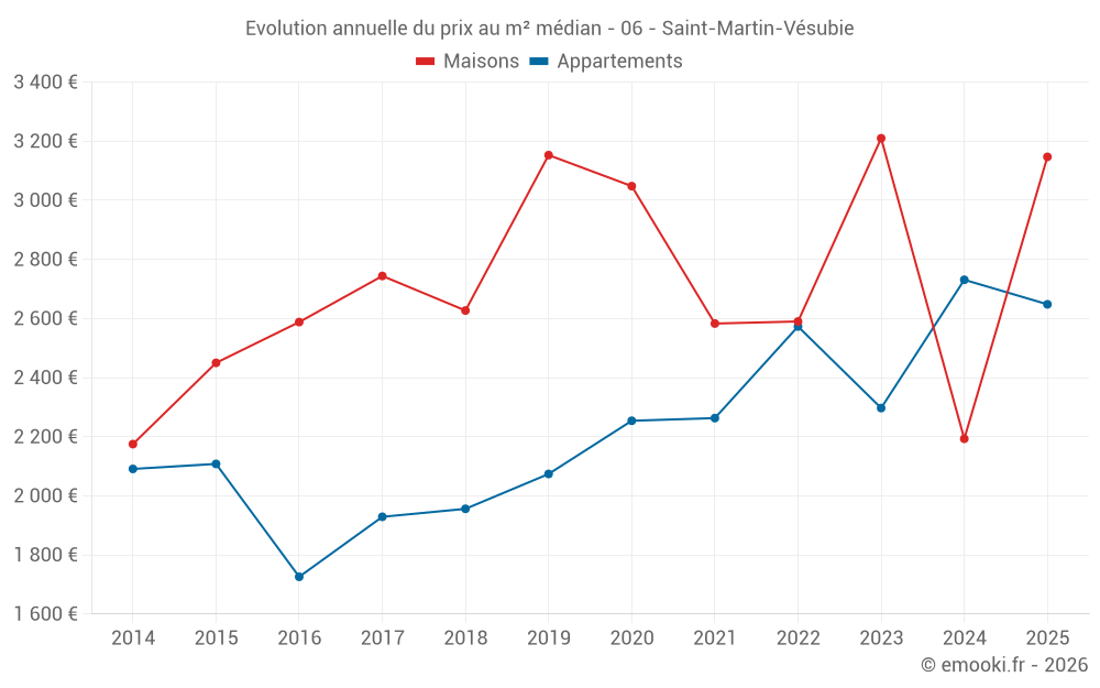 Le prix médian sur les 29 transactions de maisons des 24 derniers mois dans la commune de Saint-Martin-Vésubie était de 2 605 € par mètre carré pour une valeur foncière médiane de 195 000 €. Sur cette période 60% des transactions se sont situées entre 1 768 et 3 630 € par mètre carré (du 2ème au 8ème déciles).