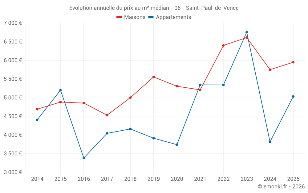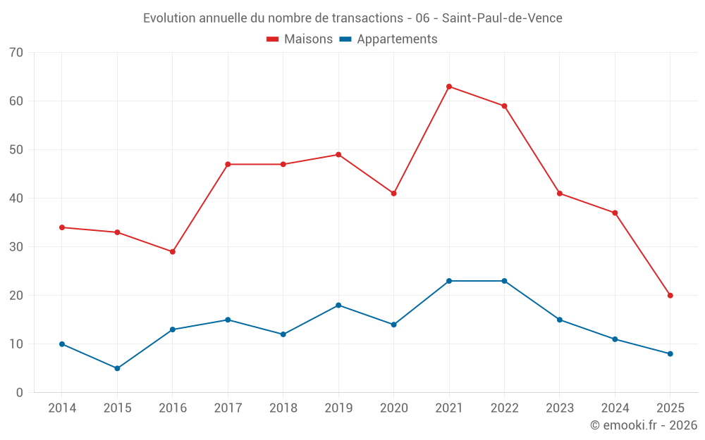 Le prix médian sur les 20 transactions de maisons des 6 derniers mois dans la commune de Saint-Paul-de-Vence était de 5 950 € par mètre carré pour une valeur foncière médiane de 968 841 €. Sur cette période 60% des transactions se sont situées entre 3 915 et 8 683 € par mètre carré (du 2ème au 8ème déciles).