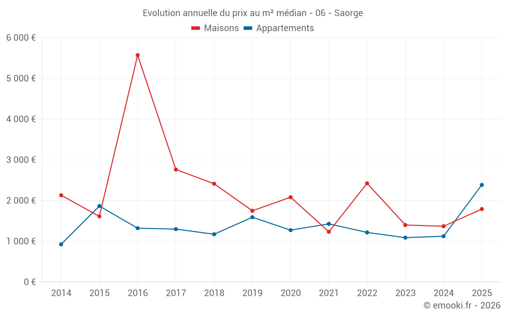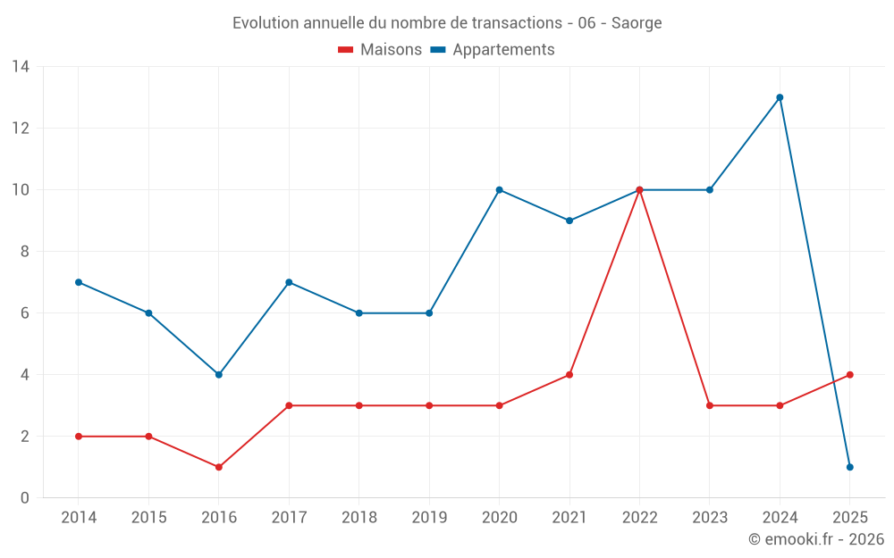 Le prix médian sur les 23 transactions d'appartements des 24 derniers mois dans la commune de Saorge était de 1 125 € par mètre carré pour une valeur foncière médiane de 55 000 €. Sur cette période 60% des transactions se sont situées entre 839 et 1 925 € par mètre carré (du 2ème au 8ème déciles).