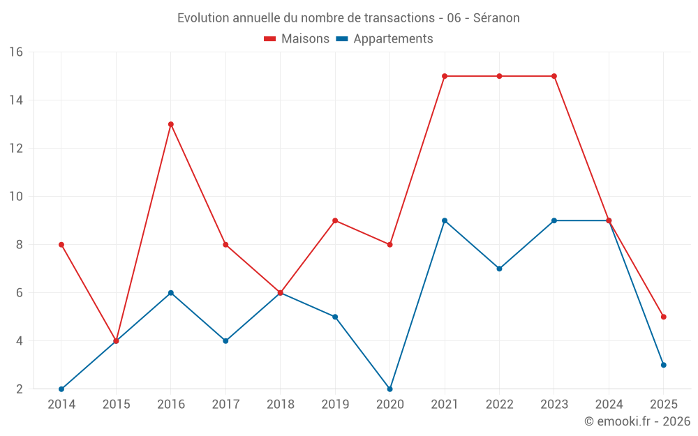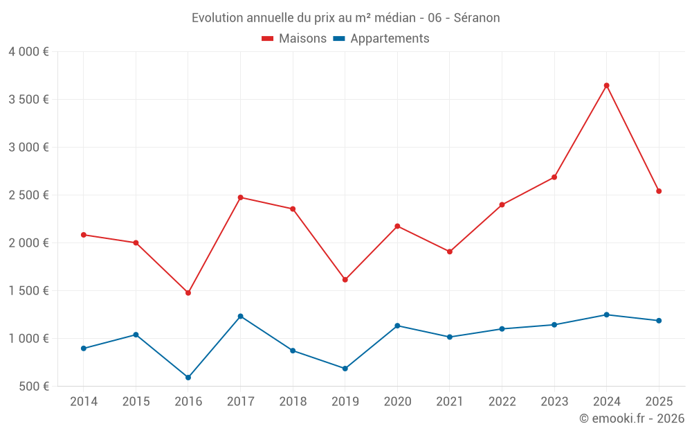 Le prix médian sur les 23 transactions de maisons des 24 derniers mois dans la commune de Séranon était de 2 899 € par mètre carré pour une valeur foncière médiane de 227 000 €. Sur cette période 60% des transactions se sont situées entre 2 495 et 3 678 € par mètre carré (du 2ème au 8ème déciles).