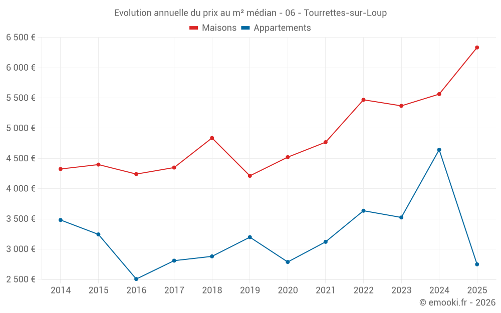 Le prix médian sur les 23 transactions de maisons des 6 derniers mois dans la commune de Tourrettes-sur-Loup était de 6 333 € par mètre carré pour une valeur foncière médiane de 840 000 €. Sur cette période 60% des transactions se sont situées entre 5 015 et 9 098 € par mètre carré (du 2ème au 8ème déciles).