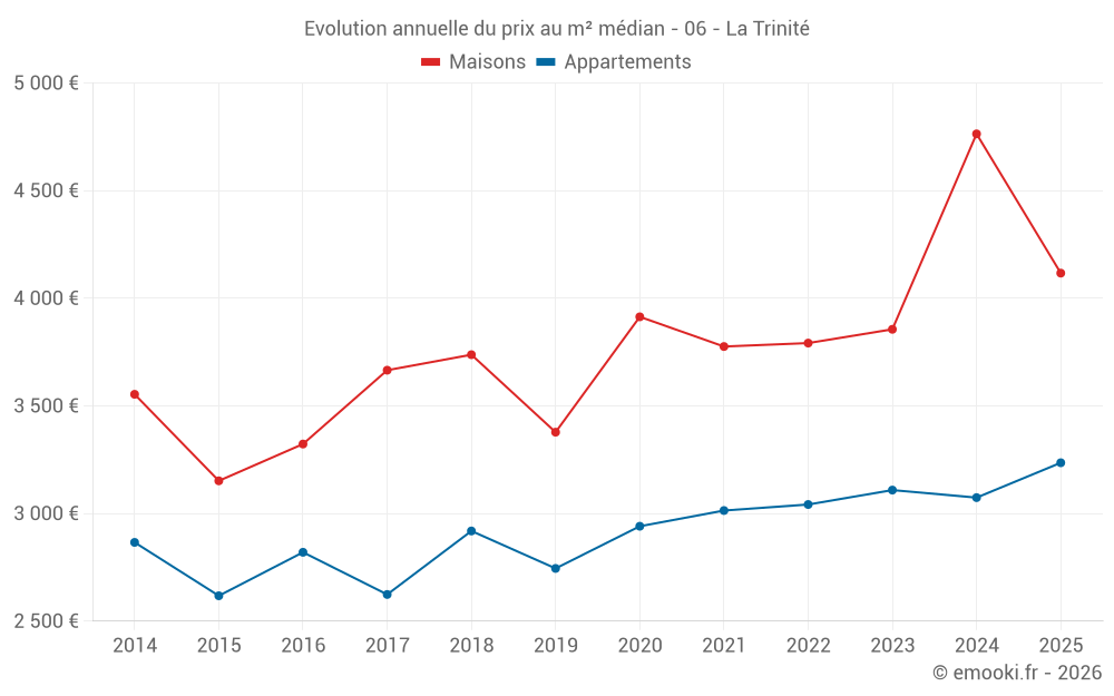 Le prix médian sur les 27 transactions de maisons des 12 derniers mois dans la commune de la Trinité était de 4 727 € par mètre carré pour une valeur foncière médiane de 375 000 €. Sur cette période 60% des transactions se sont situées entre 3 323 et 5 690 € par mètre carré (du 2ème au 8ème déciles).
