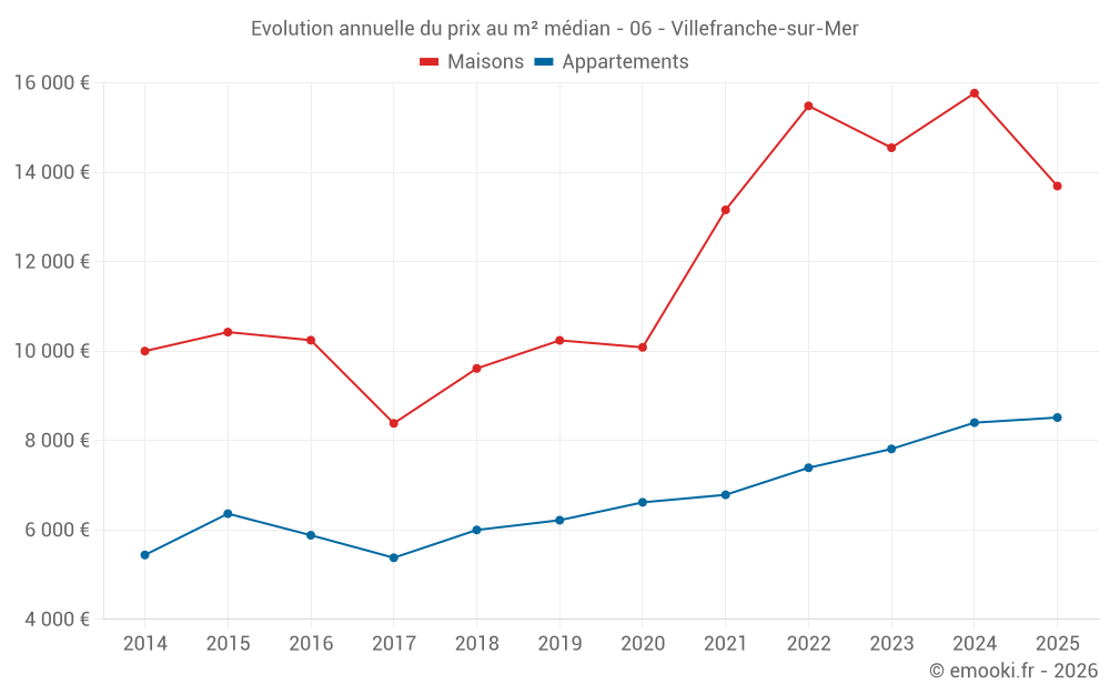 Le prix médian sur les 28 transactions de maisons des 12 derniers mois dans la commune de Villefranche-sur-Mer était de 14 967 € par mètre carré pour une valeur foncière médiane de 2 850 000 €. Sur cette période 60% des transactions se sont situées entre 11 943 et 21 378 € par mètre carré (du 2ème au 8ème déciles).
