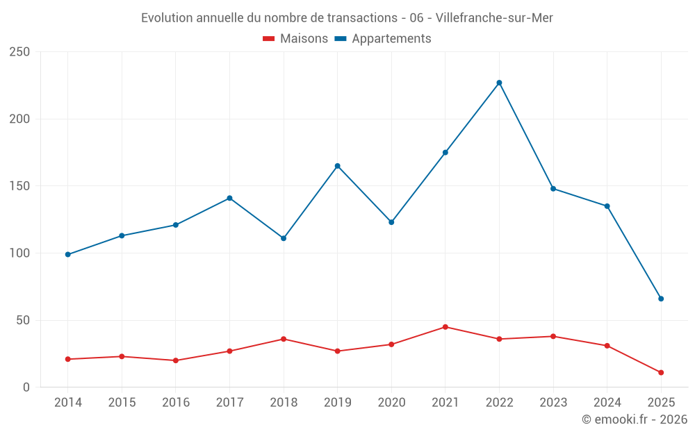 Le prix médian sur les 26 transactions d'appartements des 3 derniers mois dans la commune de Villefranche-sur-Mer était de 7 800 € par mètre carré pour une valeur foncière médiane de 372 500 €. Sur cette période 60% des transactions se sont situées entre 4 242 et 11 028 € par mètre carré (du 2ème au 8ème déciles).