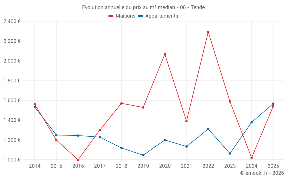 Le prix médian sur les 26 transactions de maisons des 24 derniers mois dans la commune de Tende était de 1 600 € par mètre carré pour une valeur foncière médiane de 72 200 €. Sur cette période 60% des transactions se sont situées entre 600 et 2 273 € par mètre carré (du 2ème au 8ème déciles).