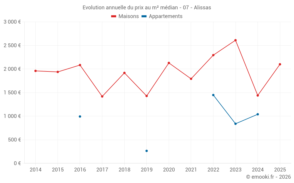 Le prix médian sur les 15 transactions de maisons des 24 derniers mois dans la commune d'Alissas était de 2 200 € par mètre carré pour une valeur foncière médiane de 210 000 €. Sur cette période 60% des transactions se sont situées entre 1 207 et 3 132 € par mètre carré (du 2ème au 8ème déciles).