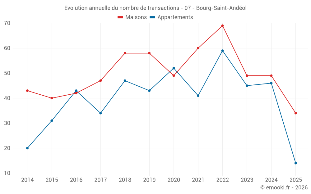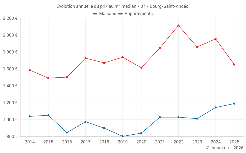 Le prix médian sur les 38 transactions d'appartements des 12 derniers mois dans la commune de Bourg-Saint-Andéol était de 1 124 € par mètre carré pour une valeur foncière médiane de 70 000 €. Sur cette période 60% des transactions se sont situées entre 902 et 1 600 € par mètre carré (du 2ème au 8ème déciles).
