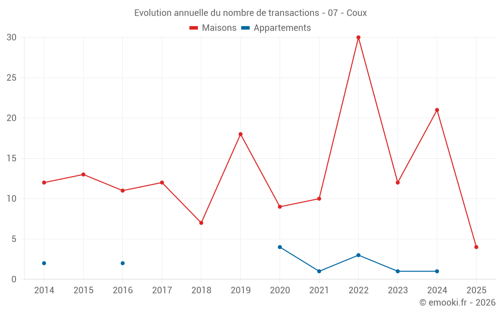 Le prix médian sur les 20 transactions de maisons des 12 derniers mois dans la commune de Coux était de 2 111 € par mètre carré pour une valeur foncière médiane de 215 325 €. Sur cette période 60% des transactions se sont situées entre 1 737 et 2 645 € par mètre carré (du 2ème au 8ème déciles).