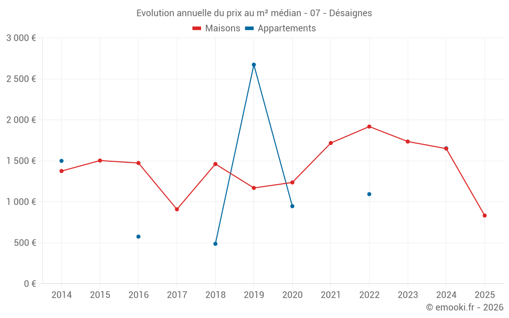 Le prix médian sur les 21 transactions de maisons des 24 derniers mois dans la commune de Désaignes était de 1 612 € par mètre carré pour une valeur foncière médiane de 120 000 €. Sur cette période 60% des transactions se sont situées entre 900 et 2 535 € par mètre carré (du 2ème au 8ème déciles).