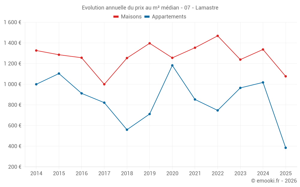 Le prix médian sur les 16 transactions de maisons des 12 derniers mois dans la commune de Lamastre était de 1 218 € par mètre carré pour une valeur foncière médiane de 129 295 €. Sur cette période 60% des transactions se sont situées entre 678 et 1 867 € par mètre carré (du 2ème au 8ème déciles).