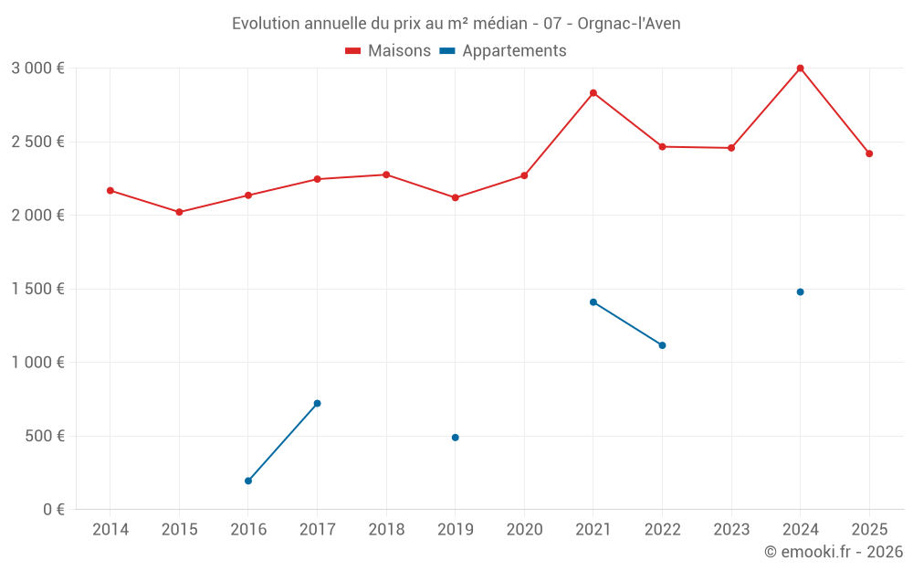 Le prix médian sur les 23 transactions de maisons des 24 derniers mois dans la commune d'Orgnac-l'Aven était de 2 862 € par mètre carré pour une valeur foncière médiane de 241 000 €. Sur cette période 60% des transactions se sont situées entre 2 080 et 3 230 € par mètre carré (du 2ème au 8ème déciles).