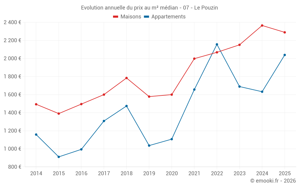 Le prix médian sur les 17 transactions de maisons des 12 derniers mois dans la commune du Pouzin était de 2 333 € par mètre carré pour une valeur foncière médiane de 190 780 €. Sur cette période 60% des transactions se sont situées entre 1 830 et 2 756 € par mètre carré (du 2ème au 8ème déciles).