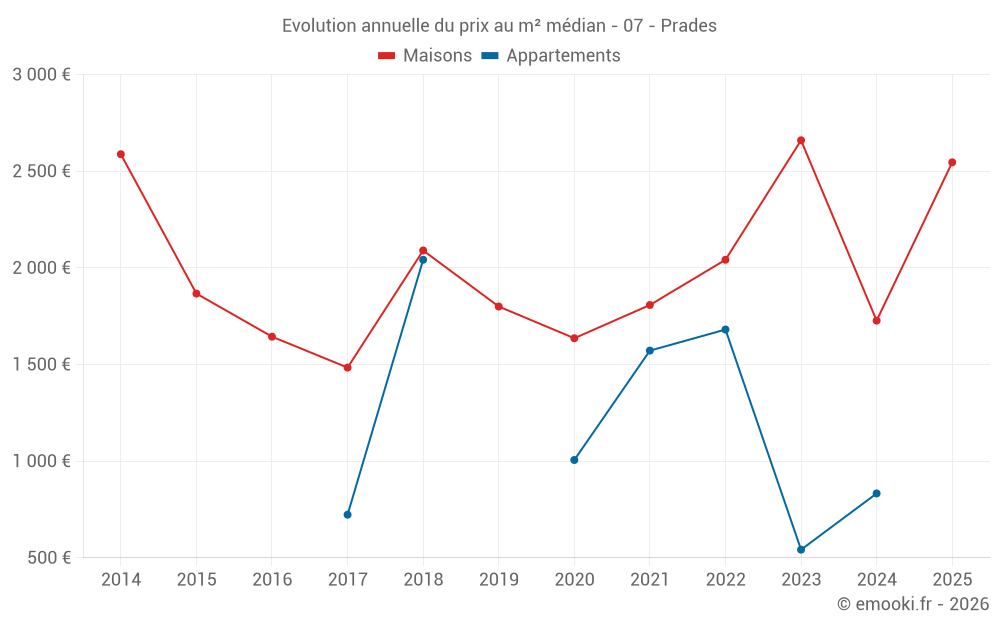 Le prix médian sur les 19 transactions de maisons des 24 derniers mois dans la commune de Prades était de 2 169 € par mètre carré pour une valeur foncière médiane de 174 200 €. Sur cette période 60% des transactions se sont situées entre 1 442 et 3 100 € par mètre carré (du 2ème au 8ème déciles).