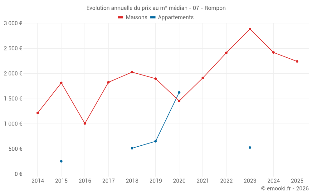 Le prix médian sur les 25 transactions de maisons des 24 derniers mois dans la commune de Rompon était de 2 512 € par mètre carré pour une valeur foncière médiane de 250 000 €. Sur cette période 60% des transactions se sont situées entre 1 184 et 3 076 € par mètre carré (du 2ème au 8ème déciles).