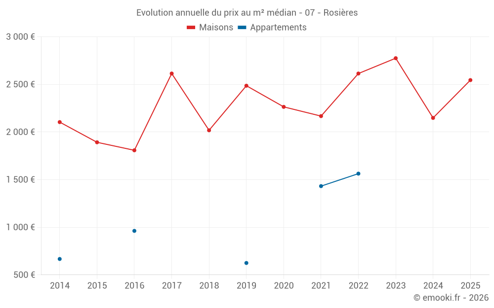 Le prix médian sur les 27 transactions de maisons des 24 derniers mois dans la commune de Rosières était de 2 400 € par mètre carré pour une valeur foncière médiane de 260 000 €. Sur cette période 60% des transactions se sont situées entre 1 636 et 2 891 € par mètre carré (du 2ème au 8ème déciles).
