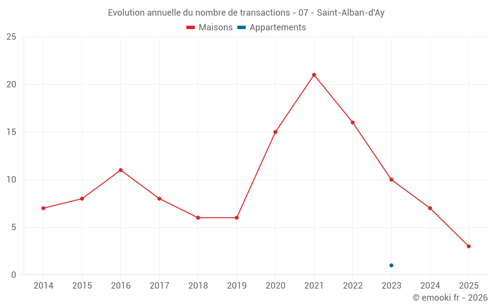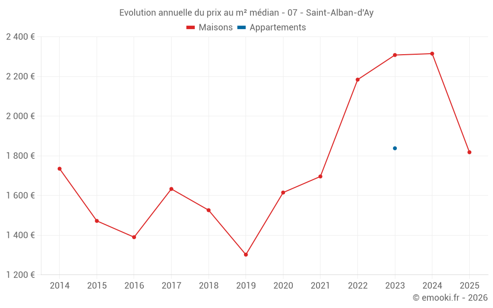 Le prix médian sur les 15 transactions de maisons des 24 derniers mois dans la commune de Saint-Alban-d'Ay était de 2 315 € par mètre carré pour une valeur foncière médiane de 179 875 €. Sur cette période 60% des transactions se sont situées entre 1 570 et 2 642 € par mètre carré (du 2ème au 8ème déciles).
